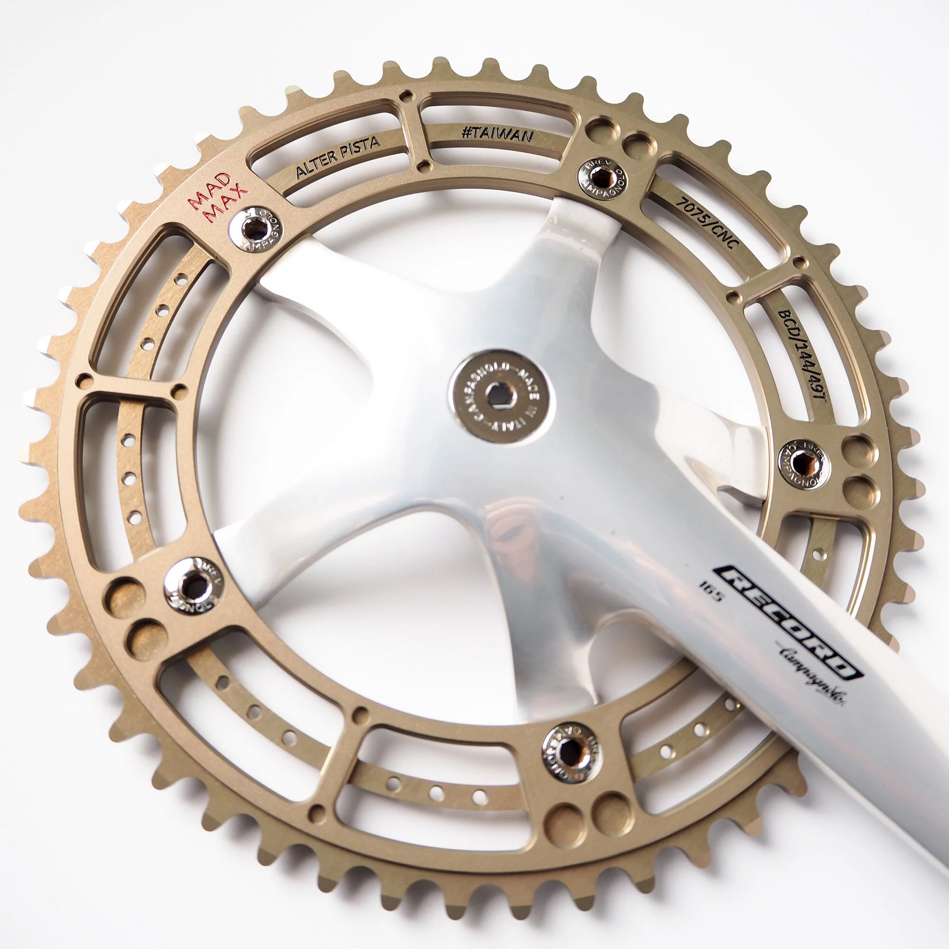 This piece of Mad Max series chainring has a unique color of champagne bronze that was created under the process of hard Anodization.